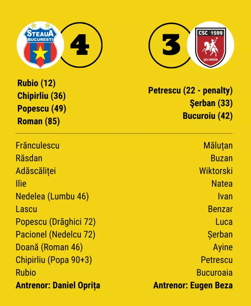 Steaua și CSC Șelimăr s-au duelat în etapa cu numărul 10 din Liga 2, pe stadionul din bulevardul Ghencea. A fost un meci spectaculos, cu răsturnări de scor și un final clasic, roș-albaștrii reușind să întoarcă scorul și să câștige după ce au fost conduși.